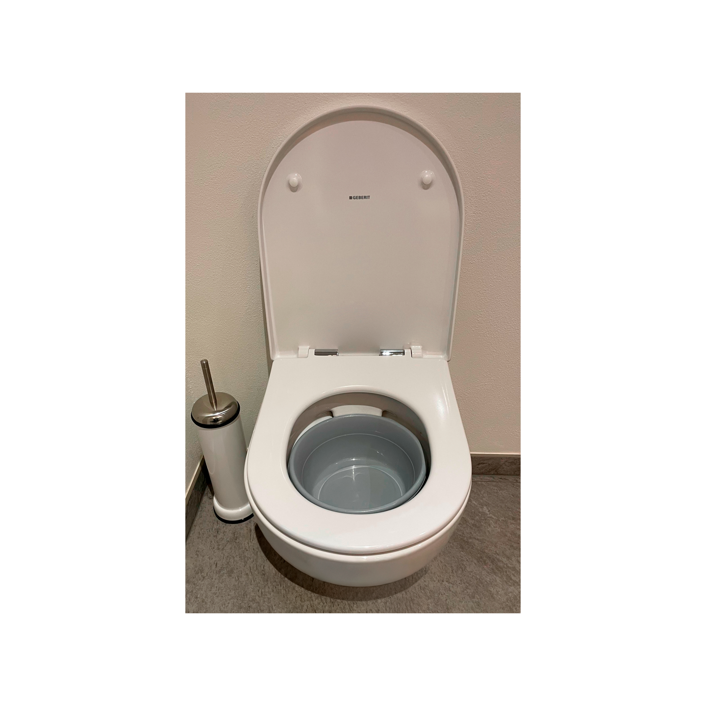 Hvis du bruger en skål eller balje til opsamlingen, skal den være så stor, at den sidder i spænd i toilettet. Hvis du foretrækker at bruge en opsamlingsindsats, kan den købes i mange forskellige webshops.